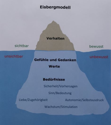 Das Eisbergmodell, von Sigmund Freud, veranschaulicht, dass der größte Teil, der uns ausmacht, uns oft selbst nicht bewusst ist und nach außen nicht sichtbar wird. Die unterschwelligen Gefühle, Gedanken und Wertvorstellungen steuern unser Verhalten wie ein Autopilot und basieren auf 5 Grundbedürfnissen eines jeden Menschen, die es sich lohnt für sich zu klären, um selbstbewusst das eigene Leben zu gestalten.